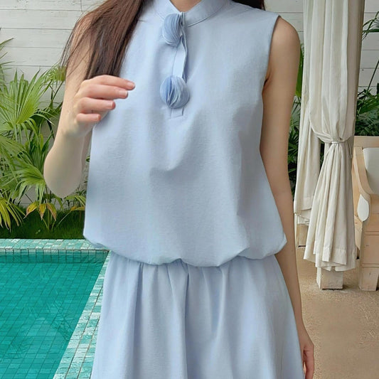 Blue Cotton Blend Stand Collar Sleeveless Peplum Vest Women's Summer New Short Crop Vest Skirt Set 3D Book Page Design
