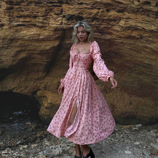 Printed square collar tied sexy slit floral dress